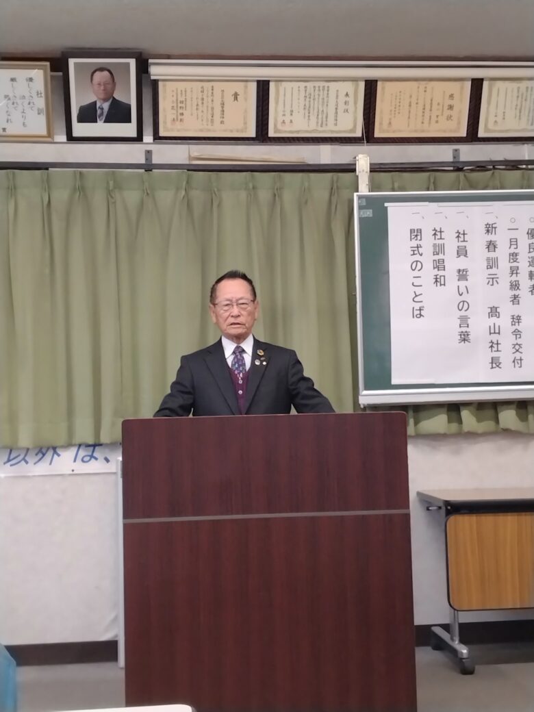 年頭式を行いました 2025年1月6日 新着情報 twitterfacebookLINEpocketPinteresthatena 明けましておめでとうございます。 今年は、昨年よりもさらに良い年になりますようお祈り申し上げます。 さて、本日年頭式が行われました。 社長より新年の訓示があり、「今年も頑張ろう!」と心新たに誓いました。 永年勤続 31名 無事故・無違反運転者 25名 優良社員推薦 22名 計78名のかたが表彰され表彰状と記念品が授与されました。 勤務の都合で残念ながら参加できないかたもいましたが 後日お渡しします。 おめでとうございました!